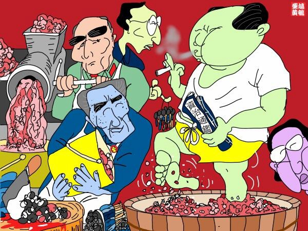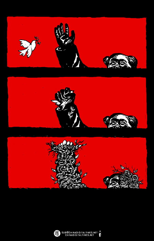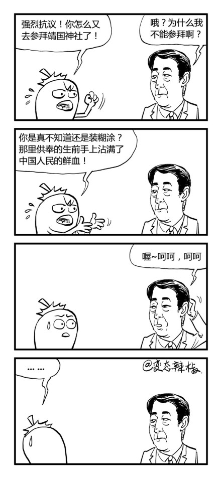 12月26日是中共前最高领导人毛泽东诞生120周年纪念日。当日,习近平、李克强、张德江等七人来到毛纪念堂参拜,向毛像三鞠躬,同时,官方媒体发表多篇评论,盛赞毛的“丰功伟绩”。巧合的是,日本首相安倍晋三也于当日参拜了靖国神社,这使得网友的对此事的创作激情被彻底点燃,许多网友以批评“政客拜鬼”的弦外之音,打开了墙内对毛反对声音的限制,例如,漫画家变态辣椒创作了一幅漫画,指出相比日本侵略者,毛同样是双手沾满中国人民鲜血的刽子手。安倍参拜靖国神社一事引发了官方媒体的猛烈批评,央视在节目中呼吁警惕“日本军国主义”复辟,环球时报发表评论建议“禁止安倍晋三进入中国”,这些言论受到了一些网民的喝彩,但也有不少网民嗤之以鼻:自己拜魔,何不许人拜鬼?