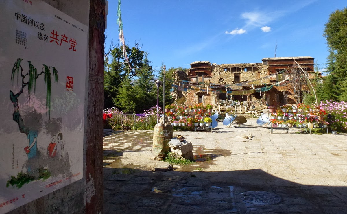 The $5 tickets to the show come with a map to the site. If there’s any question about who is selling them, the monastery down below has surrendered to the government. Locals tell me there was a feud in town between followers of this monastery, which they say had sold out, and the other monastery in town, which tries, impossibly, to maintain a sliver of independence. (You can guess which one has five gilded roofs and which has roofing held down by rocks.) Regardless, both are now deluged with tourists. The monastic town around them has doubled in size in two years. Strips of new hotels are under construction, spurred by cheap loans from the Chinese government, one non-Tibetan hotel owner tells me.