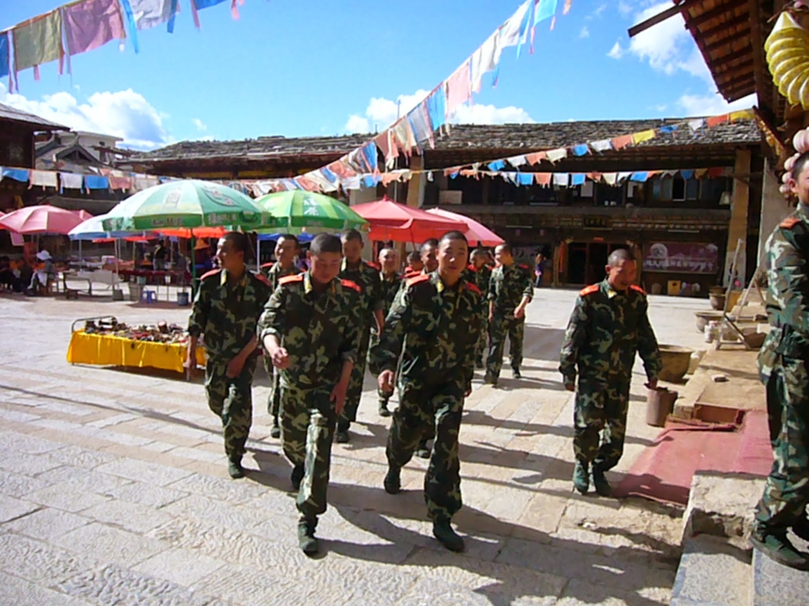 临走之前,我们去街边饭馆品尝了德钦风味的藏餐:酥油茶、酥油奶渣、牛肉干巴和荞麦馍馍,遂返独克宗,却突然遇见一群,二三十个吧,没戴帽子但穿军装的武警士兵冲向摆着各种旅游工艺品的摊子,挑三拣四,讨价还价。那些工艺品似乎都是女性饰物。那些武警士兵,可能因为没有戴军帽的缘故,更因为没有带武器的缘故,身体瘦小,脸庞年轻,眼睛紧盯着摊上的项链手镯戒指,几乎没有注意到我正对着他们拍照。那一瞬间,他们很像游客。也可以说,在没几个游客的香格里拉,他们于那一瞬间变成了游客。