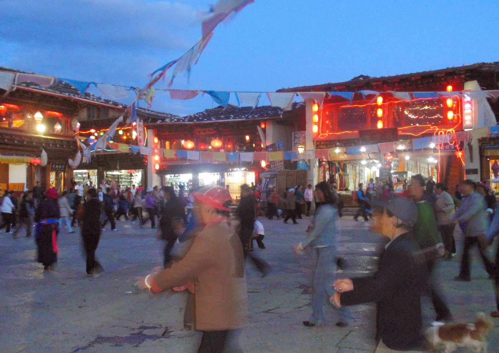 我们在新造的“独克宗古城”住了两夜,很难得地成为“稀客”——稀有的游客。记得数年前初来此地,见到的是文革标语残存的老屋,人来牛往,炊烟袅袅。之后仿丽江四方古城,全变成了客栈商店酒吧饭馆。藏人当房东,外人做老板,游客来游客去,巧舌如簧的导游甭管会不会藏语,女的一律穿拉萨式样的藏装,男的一律穿舞台上的艳俗藏装。所有的店都得备好回扣,店员和导游齐声把浙江义乌生产的各种仿藏式商品说得天花乱坠,让上当的游客掏出高价好分红。一些文艺青年男女从都市跑到这里当“藏漂”[4],过着自我放逐自我陶醉自我夸大自我迷恋的日子。当夜幕降临,独克宗背后山上那无比巨大的金光灿烂的转经筒被炫目的灯光照亮着缓缓右转,缓缓闪现刻在经筒上的坚热斯经咒[5]以及诸佛菩萨本尊空行的形象,也缓缓闪现刻在经筒上的各民族欢歌乐舞的场面,以显示民族大团结的盛世景象。据说全藏地的转经筒独此最大,当然也独此最创新,故(上海)大世界基尼斯[6]榜上有名,而当地藏人透露,在给初落成的大经筒装藏时,秘密将上万张达赖喇嘛的法像暗藏其中,不知这是否属实。