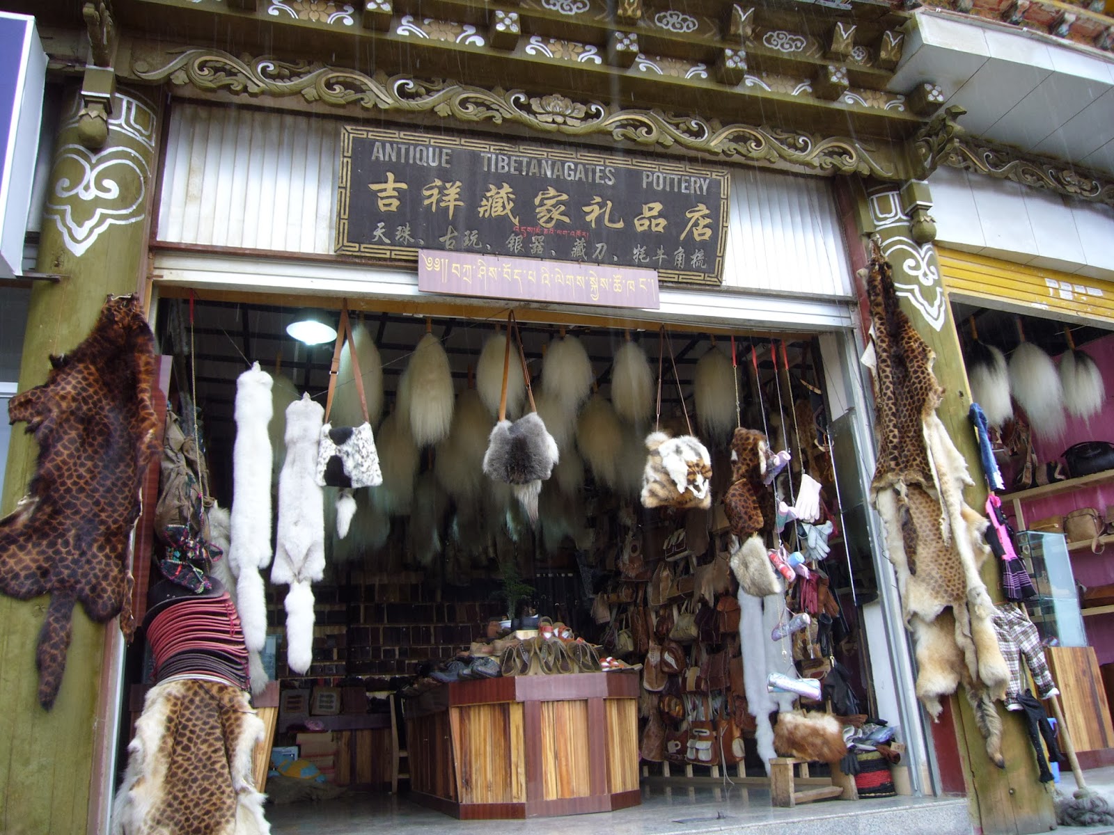 天落小雨,信步于独克宗,蓦见不少商店仍在堂而皇之地销售动物皮毛。随便走进一家,色彩斑斓的皮毛良莠不齐,有些甚至带着完整的头颅,但已干瘪,被掏去眼珠的眼睛如同黑洞。我假装游客问价,穿一皮毛背心的店主介绍:草豹皮一张600多元、藏獒皮一张800多元、虎皮一张480元,还有狼皮、狐狸皮等等。本以为诸如虎皮会很昂贵,为何这么便宜?店主热情地说,你想要什么皮子我都能找到;价格低?那是因为藏民现在不怎么买皮子了。他亦自称是“藏民”,说云南口音的汉语,除了皮肤黑,没一处像藏人,我不会被他蒙。