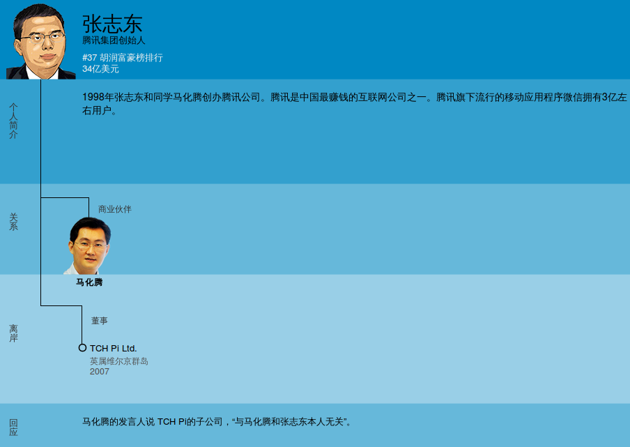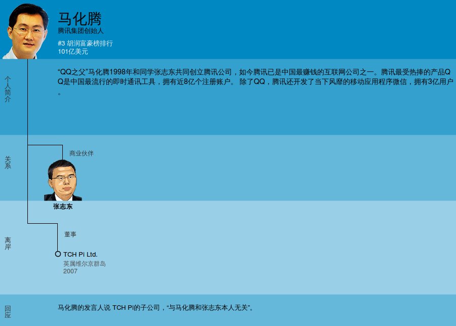 腾讯创始人、全国人大代表马化腾也持有离岸公司。2013年,马以100亿美元的身价名列“福布斯中国富豪榜”第5位。