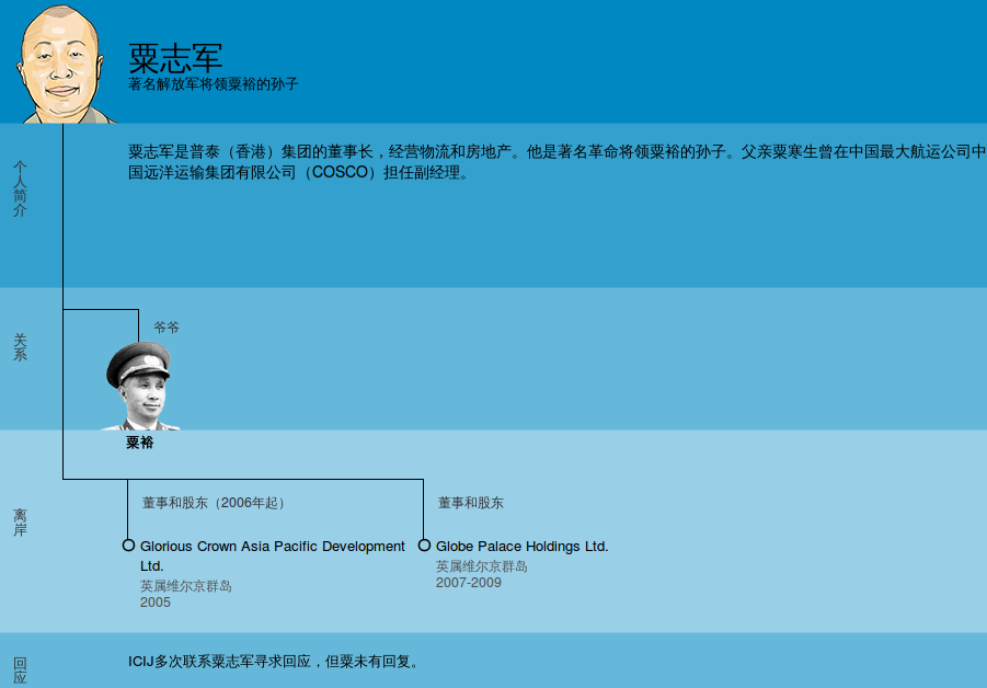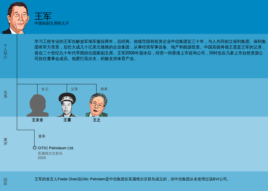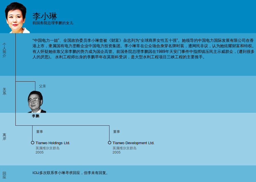 资料显示,至少有五名现任与前任中共中央政治局常委的亲属在英属维尔京群岛和库克群岛等离岸金融中心持有离岸公司,其中包括现任国家主席习近平、上届国务院总理温家宝及李鹏、上届国家主席胡锦涛以及已故领导人邓小平。