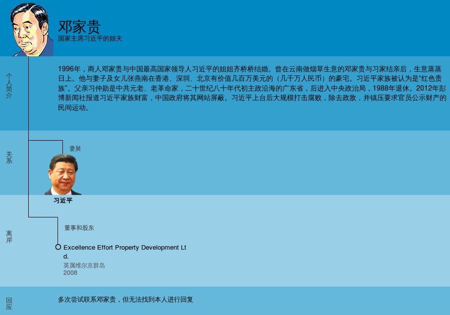在披露的离岸公司机密文件中,亦出现了齐桥桥的丈夫,也就是习近平的姐夫———邓家贵的名字。文件显示,邓家贵为“Excellence Effort Property Developement Limited”公司的总经理及持股人,该公司于2008年3月在维京群岛注册成立。邓家贵仅拥有公司一半股权,另一半则由另两位借房地产暴富的股东持有——这两位房地产大亨曾在今年6月在深圳获得中国政府对两块土地高达20亿美元的补贴,当时引得舆论一片哗然。