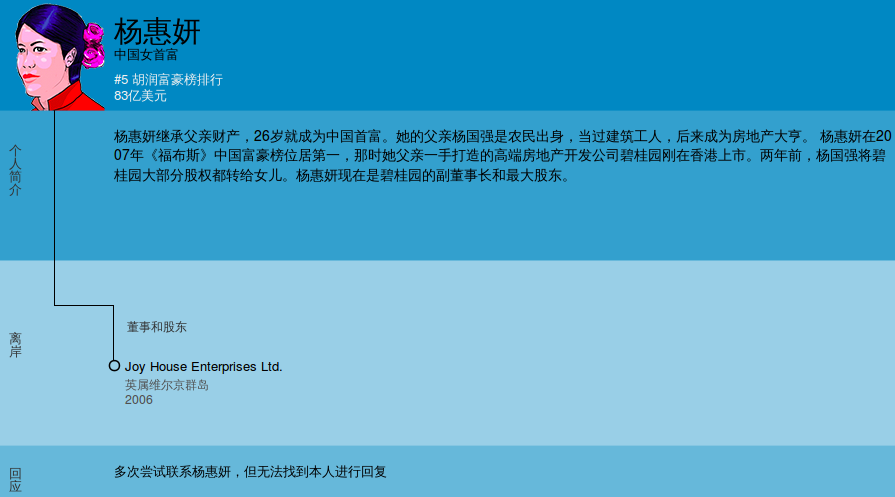 2006年,瑞银香港协助当时的中国女首富杨惠妍成立名为Joy House Enterprises的BVI公司。杨惠妍继承父亲杨国强的地产王国碧桂园,当时净资产约83亿美元。 ICIJ向杨惠妍就离岸公司事宜提问,未获回应。