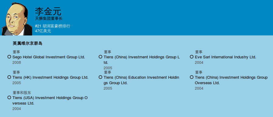 天狮集团董事长李金元是7家BVI公司的董事。这些离岸公司在2004年到2008年间由普华永道帮助成立。从ICIJ文件来看,这些BVI公司与李的天狮集团有关联。天狮涉及生物科技、旅游、电子商务和房地产等多个行业。2011年,李金元的净资产约为12亿美元。