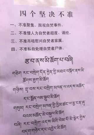 | 在2013年12月19日,甘肃省甘南藏族自治州夏河县阿木去乎寺僧人次成嘉措自焚牺牲后,当局张贴“四个坚决不准”的藏汉文通告。 |