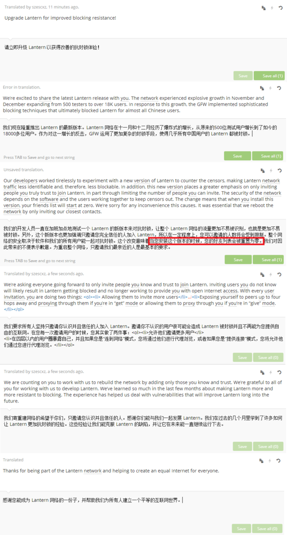 2.新版本更加强调只邀请您完全信任的人加入Lantern,所以在一定程度上,您可以邀请的人数将会受到限制。整个网络的安全取决于软件和我们的所有用户能一起对抗封锁。这个改变意味着当您安装这个版本的时候,您的好友列表会被重置为零。我们对因此带来的不便表示歉意。为重启整个网络,只邀请我们最亲近的人是最基本的要求。