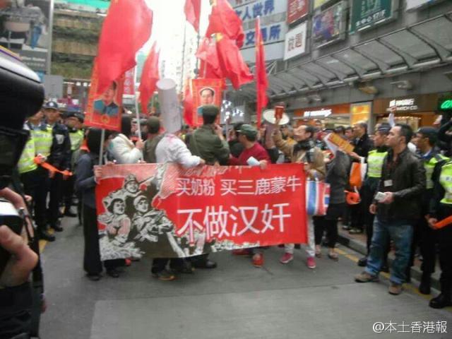 尽管如此,香港反自由行旅客的行动并未息止,逾200名港人9日响应网上号召参加在旺角举行名为“爱国爱党大游行”,不少游行的市民打扮成文革时期装束,挥舞五星红旗、胸前挂上毛章、手握毛语录、高唱文革红歌等;有人更打扮成思想不正确受批判的“牛鬼蛇神”,接受群众公审,承认不应追求资本主义的名牌货。也有游行人士自制标语,“爹亲娘亲,不及三鹿强身”;“不喝中国奶,不是中国人”;“爱祖国用国货,爆炸都用”。有人扮自由行旅客拖拉旅行皮箱,写上“国人买洋货,国家无希望”。