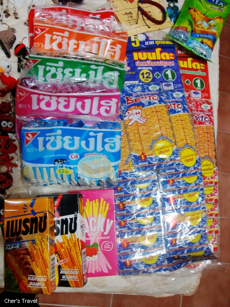 下一個戰場,泰國的零食非常有名,香蕉口味的POCKY一盒只要10元泰銖,旁邊還有台灣超市在賣辣魷魚,價格竟然只有台灣的二分之一,馬上把購物車塞得滿滿,把床鋪上全都放滿戰利品,當下露出得意的笑!總算這次旅行沒有白來。