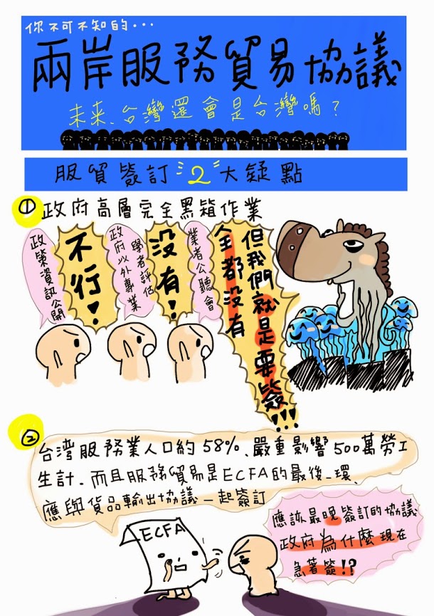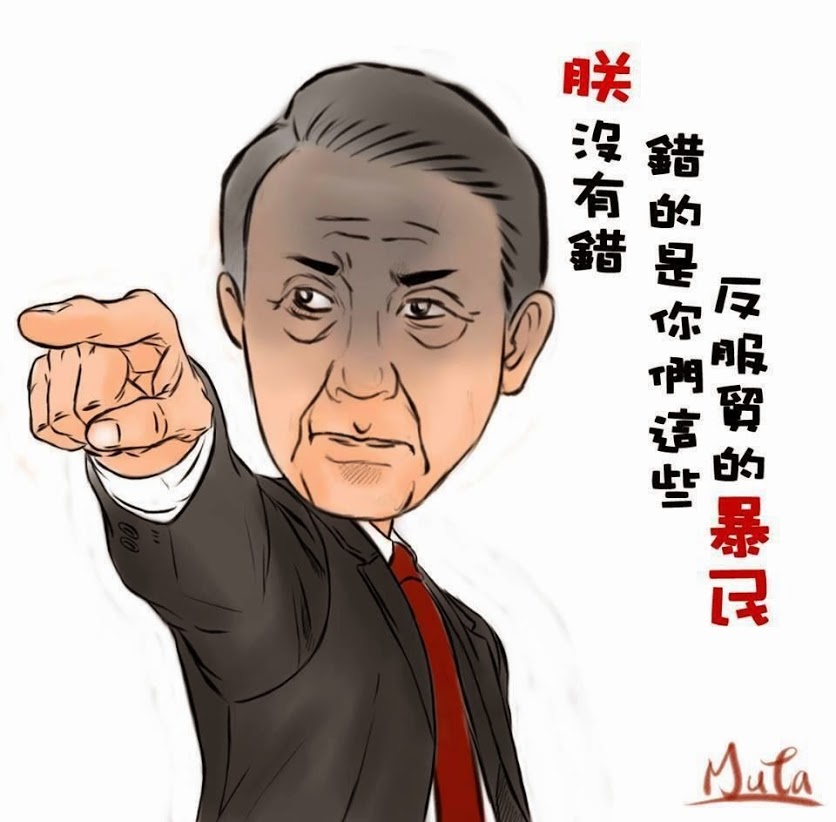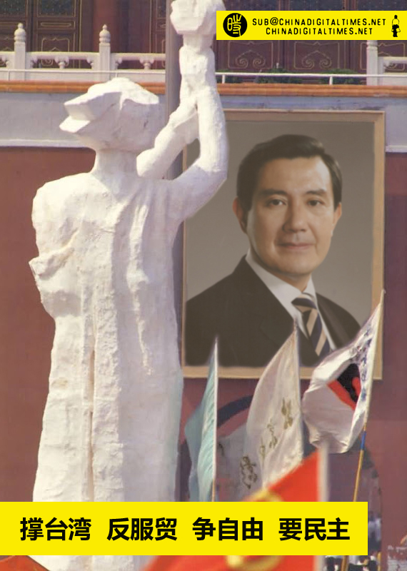 3月18日,台湾反对服贸协议“黑箱作业”的数百名青年学生占领立法院,抗议政府以“非民主”手段(优势席位表决)强制通过了基于两岸之间经济合作的ECFA协议,要求对ECFA协议进行“逐条实质审查”甚至拒绝此协议的签署。此后,学生抗议者坚守立法院数日之久。23日,马英九召开记者会对“反服贸学运”做出回应,同意就协议细则进行重审,但同时强调了自己力挺服贸协议的决心,这一公开回复并未得到多数抗议者的认可。23日,部分反服贸的学生、民众转移阵地至行政院于次日凌晨遭到警方强制驱赶,双方爆发肢体冲突,出现流血事件。台湾反服贸运动在大陆网民眼中看法有较大分化,例如有网友籍此抨击台湾“坏民主”,颇有为现行制度开脱的意味;有网友斥反对运动中的学生为“不理性”、“暴力”、“民粹”,认为其行为扰乱了社会秩序;有网友对反服贸运动中的一些排外倾向表示愤怒或不理解;有网友对反服贸运动寄于高度肯定,认为是台湾民主化进程中非常重要的部分;有网友则把焦点置于对大陆“坏政府”的批评,认为如香港占领中环、台湾反服贸协议本质都是反对中共政府。