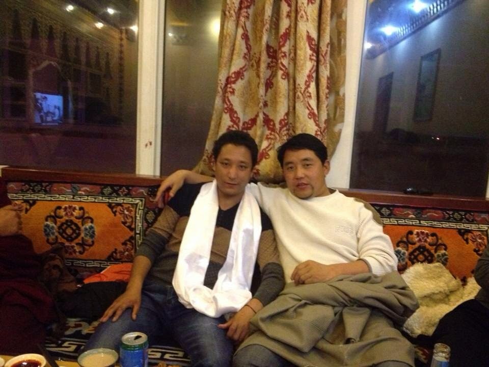 这张照片上,与戴着洁白哈达的铁让合影的是藏人作家尕藏金巴。37岁的尕藏金巴是安多拉卜让(今甘肃省甘南藏族自治州夏河县)人,定居阿坝县。因撰写有关2008年抗议的文章,他被定罪“涉嫌煽动分裂国家罪”,于2010年7月19日从阿坝家中被捕,被四川省阿坝州中级人民法院判刑3年,被关押在四川省绵阳监狱,2013年7月18日获释。