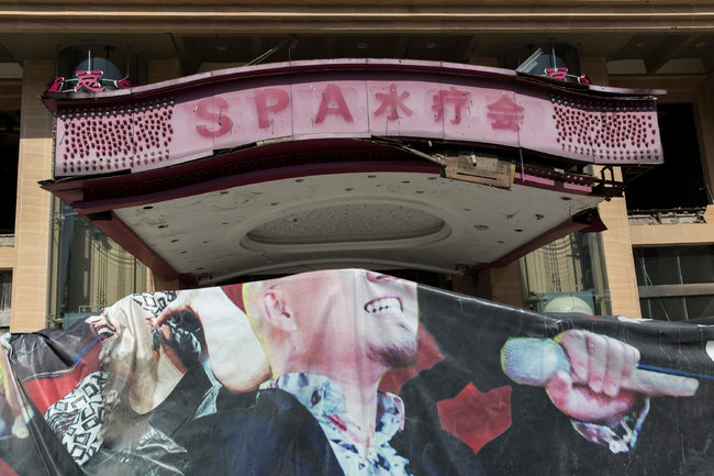 酒店三楼还有家卡拉OK厅,但已被警方查封。绘有龙纹的双开门紧闭着,可以通过上面的一道缝隙往里窥探。门前的告示写着,“停业装修。不便之处,深感抱歉。”