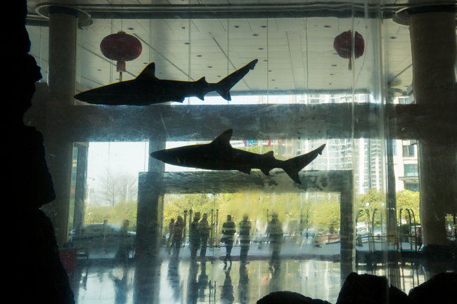 - 东莞会展国际大酒店大堂的水族箱,里面游着鲨鱼等水生动物。