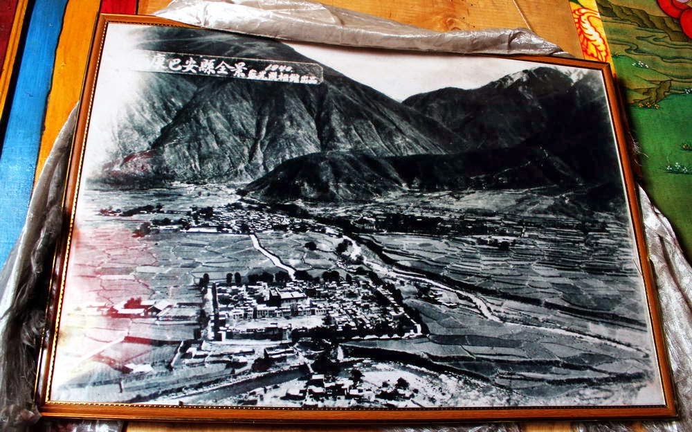 | 1940年的巴塘县及曲德贡巴。(照片下方广大的建筑物是寺院) |