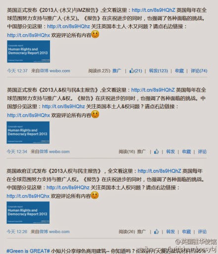 翻墙 | 英国驻华使馆官微无法发布人权报告微博 2014年4月11日 原文 @freemoren:英国驻华使馆官微说多次尝试仍无法发出关于《2013年人权与民主报告》的微博。 微博地址 翻墙技术博客订阅地址及社交帐号 所在分类:科学上网标签:防火长城 相关文章 【CDT报告汇】InterSecLab:防火墙之父方滨兴旗下公司将最先进审查技术出口海外(外二篇) 【网络民议】什么原因造成了中国8月20日凌晨突发的网络中断? 【CDT报告汇】墙中之墙:河南大力兴建省级防火墙,封锁网站数量达防火长城十倍(外二篇) 【404档案馆】第84期:“俄罗斯胜利了,普京胜利了!”——中国舆论怪相的高墙是如何建成的? 奇客资讯|研究证明互联网只会放大并不会创造新的暴民
