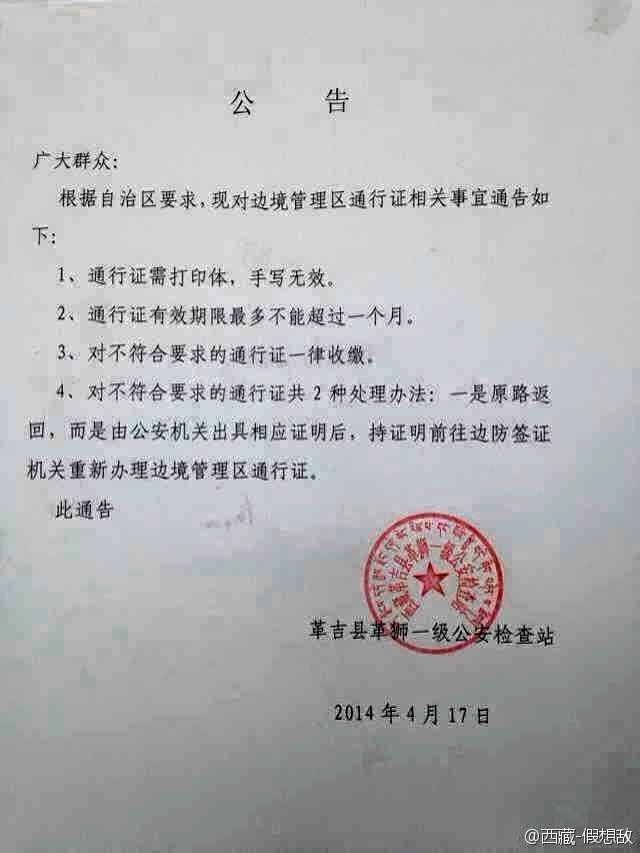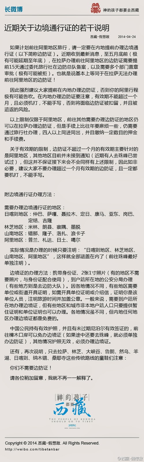 有消息说:“目前西藏本地已经停止给司机办理去阿里的边防证,现有证件截至4月30日为止。”“到五月底之前边防总队最多允许发放不超过1000张边防证,但五月之后目前没有任何消息。”