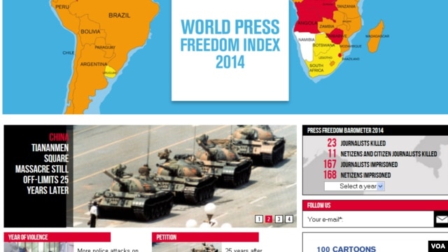 在1989年六四事件25周年前夕,记者无国界组织发布新闻稿指出,25年过去了,六四事件在中国仍是禁忌话题,中国记者被逮捕,社交网站遭审查,中国人民仍旧享受不到新闻自由。
