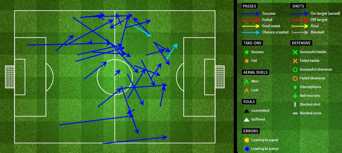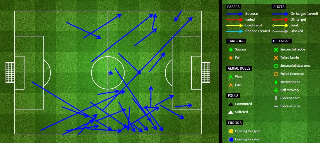 維路素在中場中路為球隊作的保護不多,僅有兩次攔截,其中1次更是在前場打拿姆荷包,成功解圍亦只有1次,比起前圖對手拿姆活躍程度更低。
