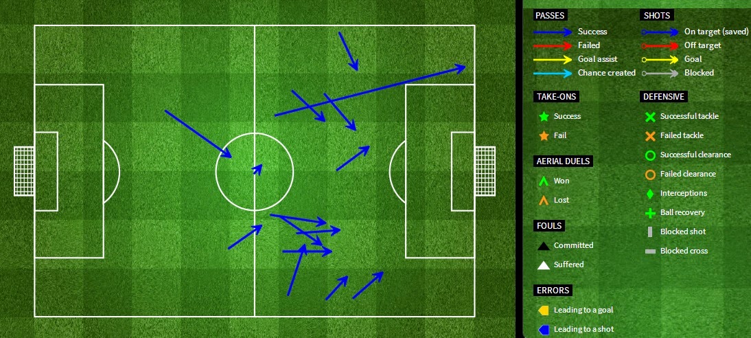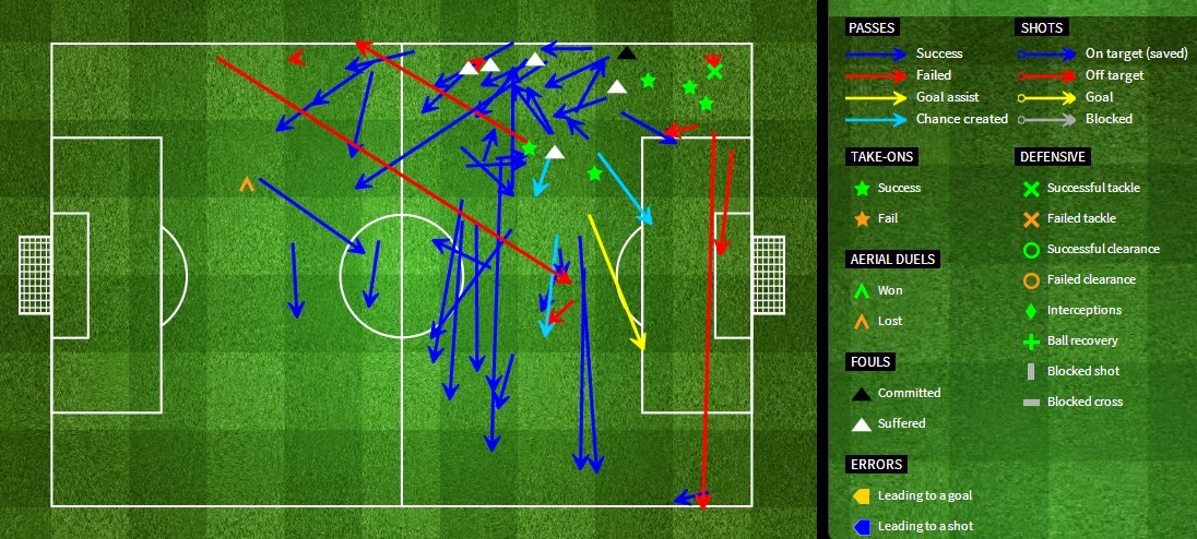 夏薩特傳球次數49次,但實際成功為隊友創造機會入禁區的機會只有2次(1次淺藍箭咀及1次黃色箭咀的助攻),另外2次為隊友提供的只是不具威脅的遠射機會。