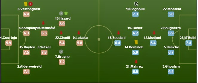下半場開波比利時教頭兼名宿韋莫斯作出第一個調動,由梅頓斯入替上半場表現慘不忍睹的查迪利,梅頓斯為比利時的反勝起了關鍵的作用。梅頓斯在初段已有1次右路底線傳中的機會,另外他的角球處理具一定威脅。雖然後來他的突破能力並不明顯,但最終參與右路反擊走位為球隊反勝。至於第二個調動奧尼就比較大膽,以年青射手及入球數字不高入替隊中王牌盧卡古,第三個調動以費蘭尼入替丹比利,事實上這個調動起初是值得商榷,既然先前換走盧卡古,後來又換入高大的費蘭尼,意義何在呢?不過費蘭尼用表現回應質疑,他在禁區走動及現位的能力確比盧卡古高,接應迪布尼傳中頂入追平的一球。