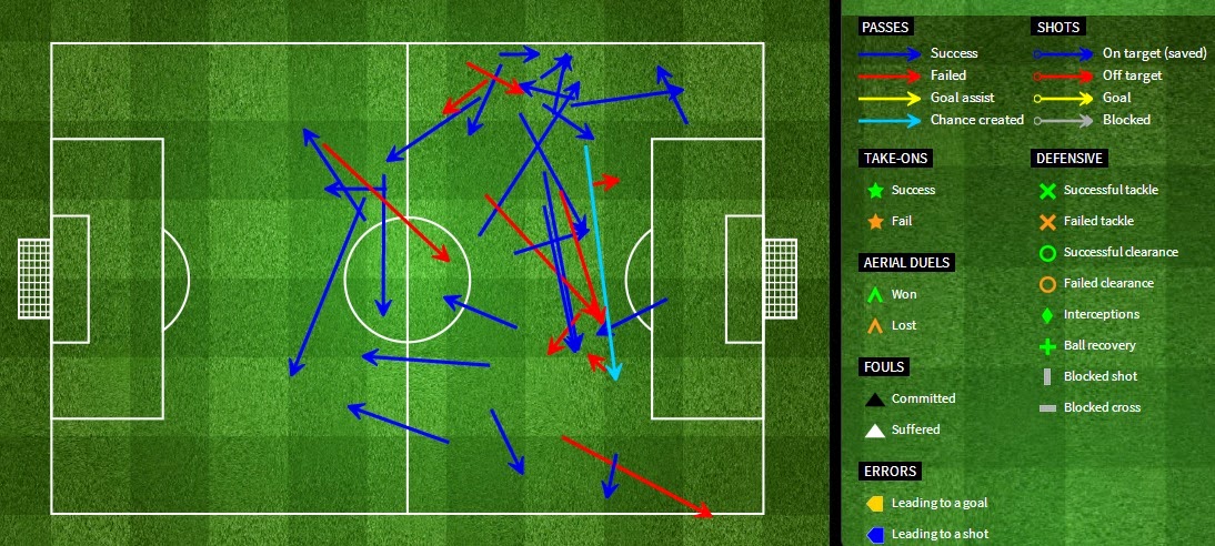 法比安莊臣在右路積極參與進攻,甚至在敵方禁區附近接應,不過沒有交出傳中球。