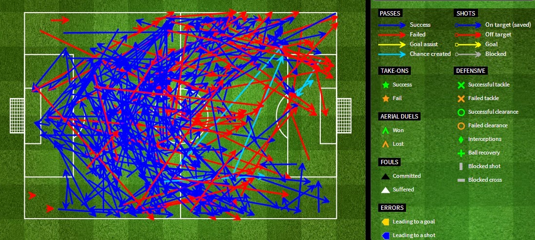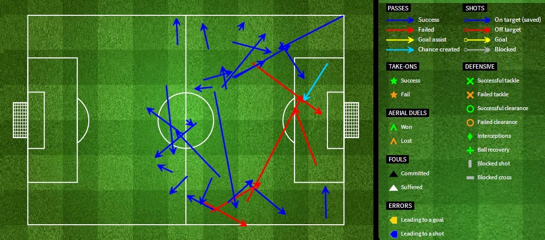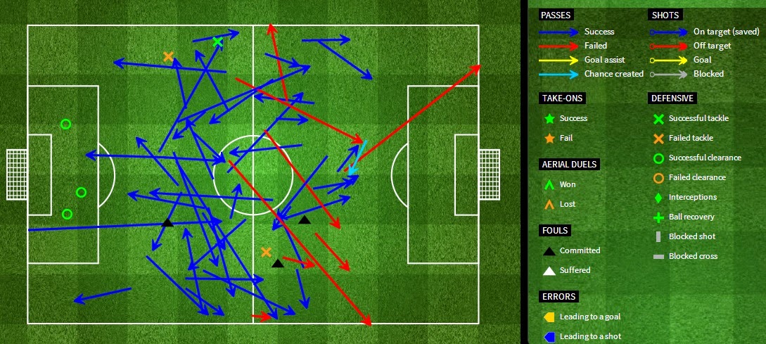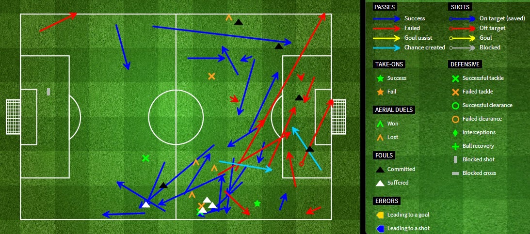 梅拿開波初段的位置偏向右翼,在下半場高路斯離場後則走回中路與舒爾尼有更多的交叉走位,在不同位置上也有傳球。