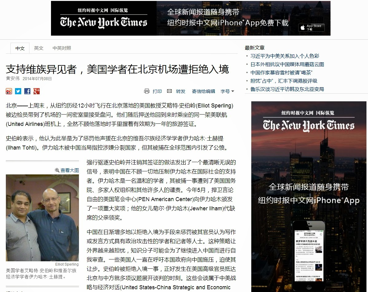 作者之一鲍文德(Gardner Bovingdon)是史伯岭在印第安纳大学中央欧亚研究系的同事。2013年5月,在朋友代表他游说中国官员后,鲍文德获得了签证。目前身在哈萨克斯坦的鲍文德接受电话采访时表示,他在一个月后抵达北京,但在机场遭边检员拒绝入境,就跟史伯岭上周六的遭遇一样。在被长期禁止访问中国期间,鲍文德在哈萨克斯坦做研究。