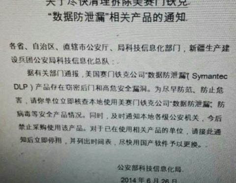 同时有网友发出信息称公安部下发禁令要求下属单位停止使用存在窃密后门和高危安全漏洞的美国赛门铁克杀毒软件。