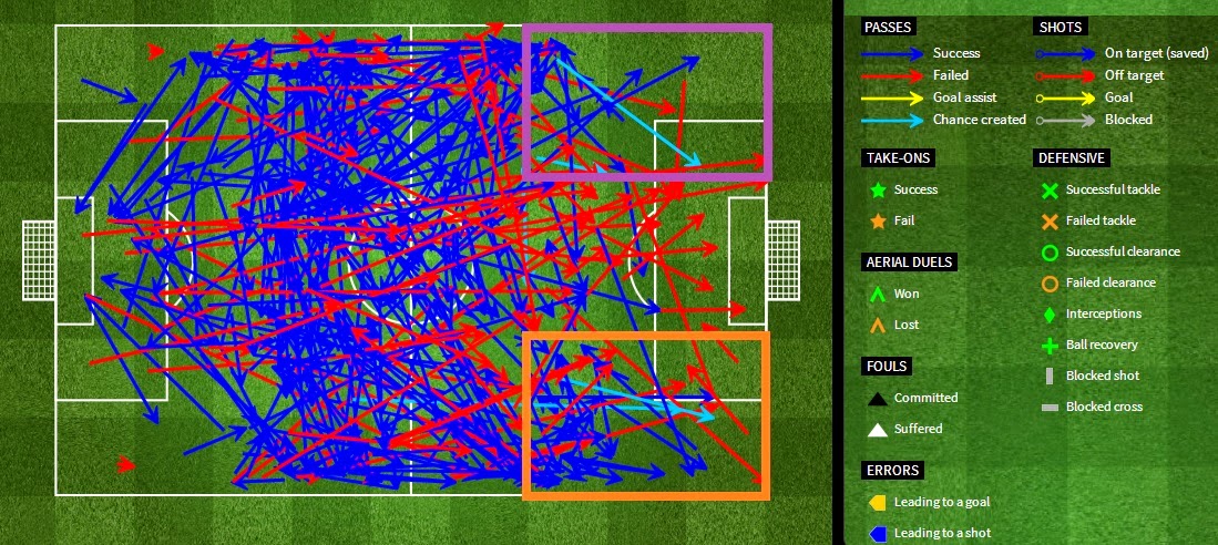 同時,阿根廷的右路(橙色框)傳球明顯較左路(紫色框)密集,重點打擊德國左方中堅出身的賀維迪斯。