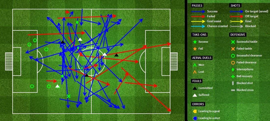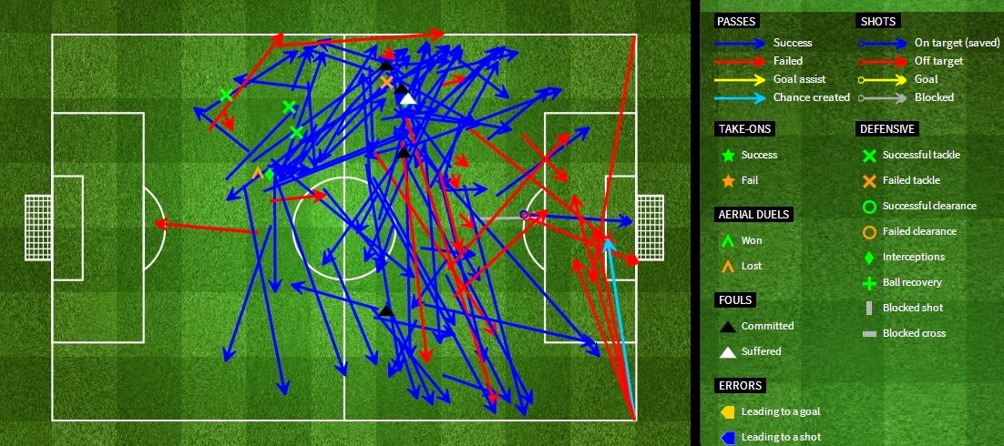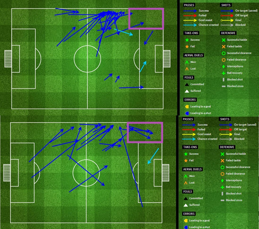 舒爾尼接應傳球路線圖(上圖為葛斯入替前,32-88分鐘,下圖為葛斯入替後,88-120分鐘)
