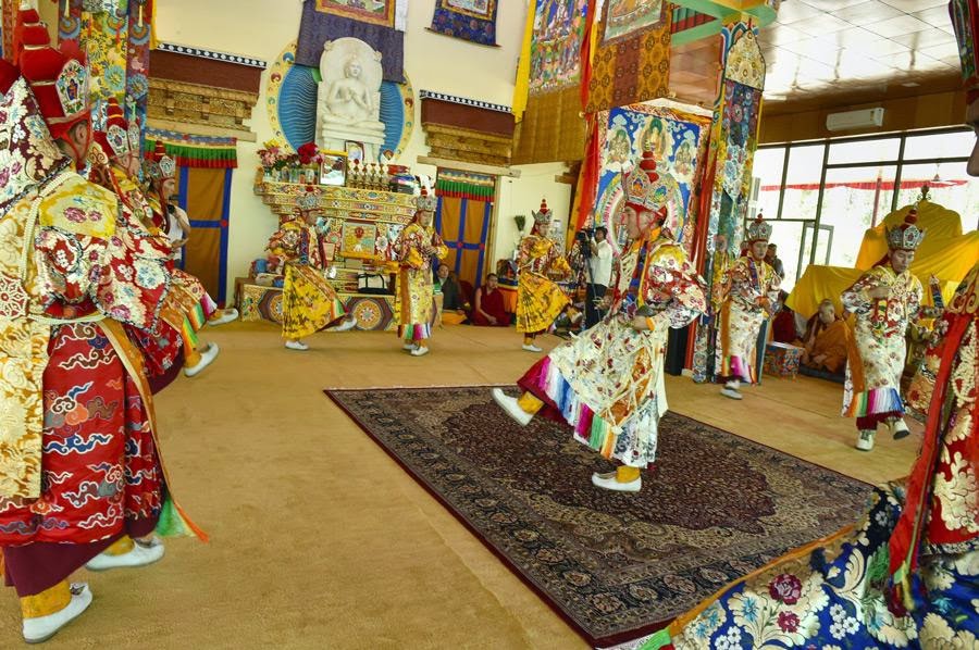 3)朗杰寺僧众演示时轮金刚法舞,进行安置场地,施舍无形有情,排除灌顶外在障碍,殷请十方诸天护法等仪式;