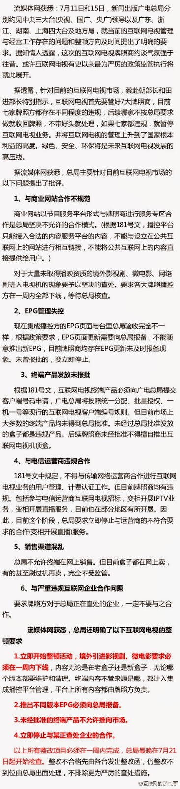 翻墙 | 广电总局下达互联网电视最严整改令 2014年7月15日 原文 新闻出版广电总局要求牌照方:1.立即开始整顿活动,境外引进影视剧、微电影要求必须在一周内下线。2.推出不同版本EPG必须向总局报备。3.未经批准的终端产品不允许推向市场。4.立即停止与某正查处企业的合作。所有整改项目必须在一周内完成。 翻墙技术博客订阅地址及社交帐号 所在分类:科学上网标签:GFW,翻墙,广电总急 相关文章 【CDT关注】西郊密林|中国数字时代:我们是当下的“抵抗媒体” 【年终专题】“我当兵当错了,入党入错了”……2025年度视频 【异闻观止】四川在线|某国企员工长期“翻墙”被捕!国家安全部披露 建设性意见|北邮成功研发“卫星互联网防火墙”,SpaceX的星链都没有! 【404文库】布鲁斯出海日志|尼泊尔“Z世代革命”:政府封禁社交媒体引燃年轻人的怒火
