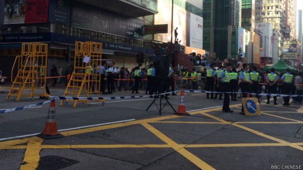 BBC中文网记者陈志芬在旺角现场报道说,执达主任到场前,在场留守多时的示威者收拾帐篷及私人物品。