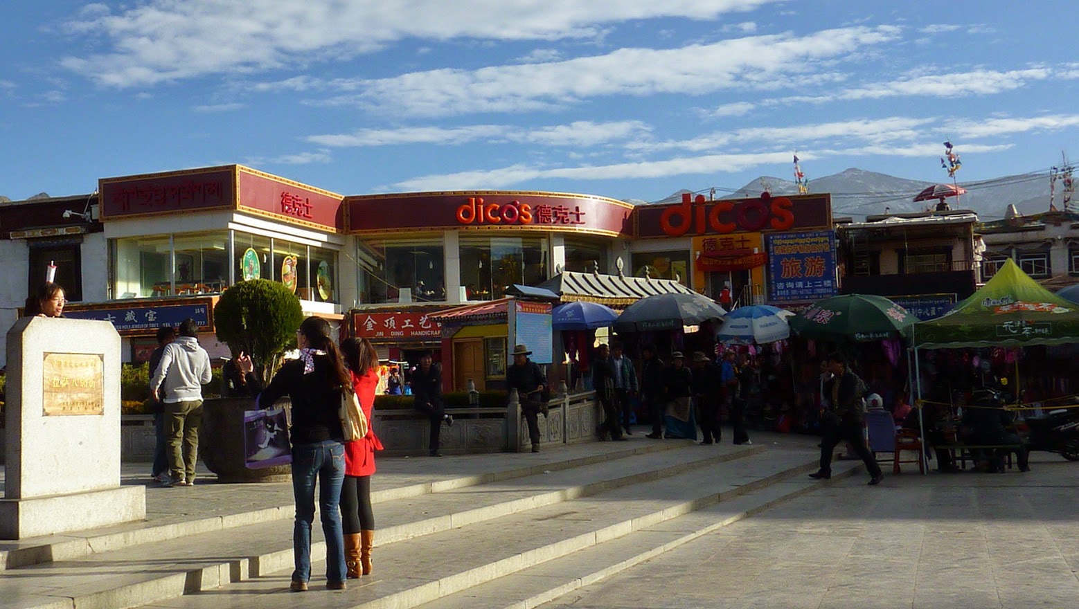| 这张照片上,挨着“德克士”的藏房二楼即是扎西次仁先生的家,而房顶上的遮阳伞下,则是从2008年起就驻守于此的狙击手。 |