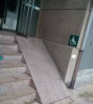 某银行门口出现的急速轮椅坡道,不过一扇玻璃门却阻挡了残疾人朋友寻求刺激的机会