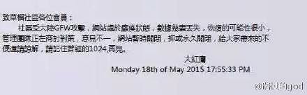 (图:致草榴社区各位会员:社区受大陆GFW攻击,网站处于瘫痪状态,数据几近丢失,恢复的可能性很小,管理团队正在商讨对策,意见不一,网站暂时关闭,抑或永久关闭,给大家带来的不便还请谅解,请记住曾经的1024,再见。)