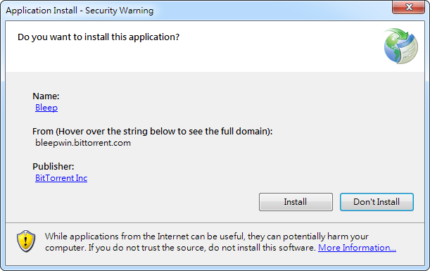 将 Bleep 下载後执行、安装,安装前会侦测系统有没有必要的元件,若没有会自动下载,当跳出安全性警告讯息时,点选 Install 来进行安装。