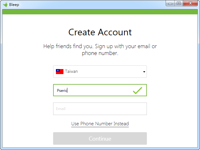 选取国家、填入你要使用的昵称、Email 後,按下 Continue 来进行注册。比较特别的是 Bleep 可以建立一个匿名(Incognito)帐户,将画面往下拉,点选 Continue Incognito,只要把你的公开密钥(Public Key)或 QR Code 给联络人,将你加入清单後无须登入即可使用 Bleep 传讯。