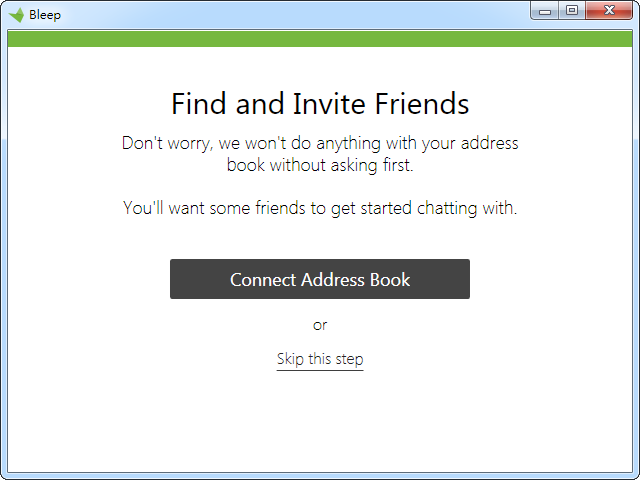 Bleep 允许使用者直接汇入 Google 通讯录,或以 Email、SMS 简讯、QR Code 或一组公开密钥(乱数随机组成)来邀请、加入联络人,如果你已经有一个帐户(其实 Bleep 并不要求使用者注册,可以使用匿名),也可以使用 Android 应用程式来接收讯息。Bleep 目前支援 Windows、Mac 和 Android 三大平台,除了传送文字讯息外,也能让联络人进行语音通话,不过还没有传送图片、档案或表情图案等功能。