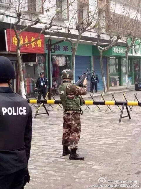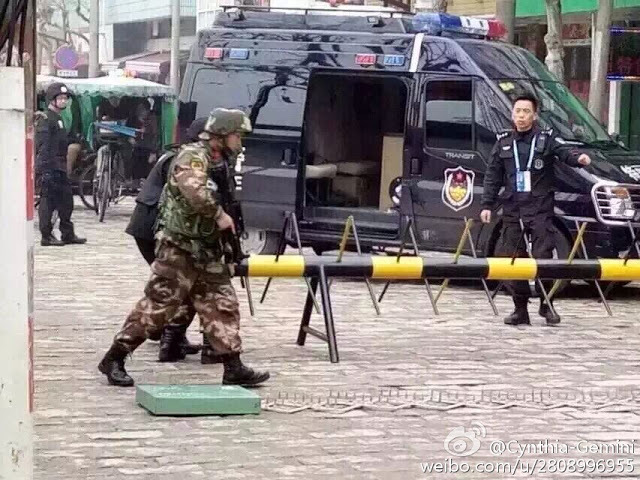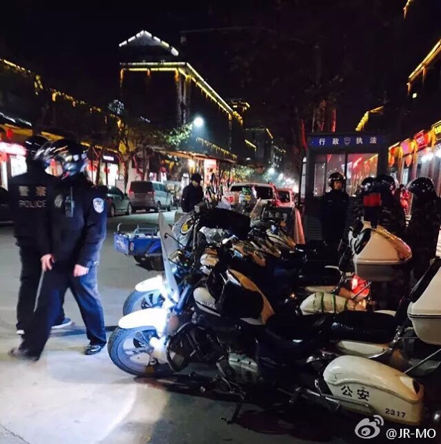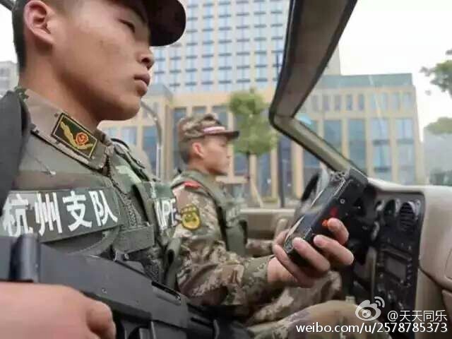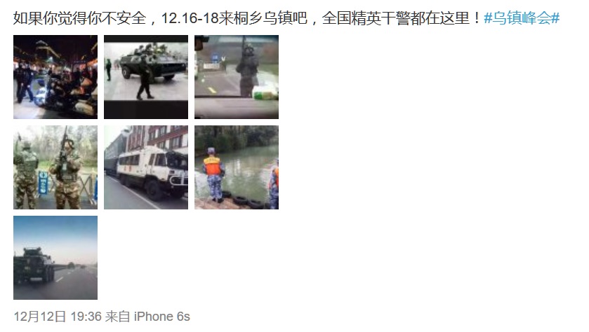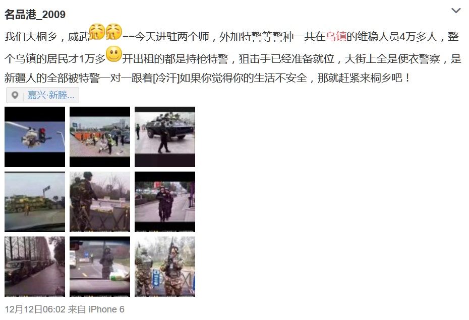 乌镇网友称:「我们大桐乡,威武~~今天进驻两个师,外加特警等警种一共在乌镇的维稳人员4万多人,整个乌镇的居民才1万多,开出租的都是持枪特警,狙击手已经准备就位,大街上全是便衣警察,是新疆人的全部被特警一对一跟着」。