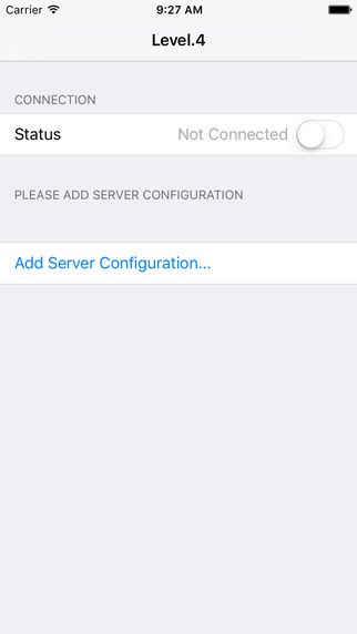 说明你已经成功启动了lightsword。接下来就可以在Appstore下载level.4安装iOS端了。别忘了切换到香港区或者美国区,大陆区搜不到的,因为软件作者很低调,也没很多人在用,所以多翻几页找找,实在找不到也可以搜索作者名字Wenyi Yang试试 ,懒人直接点这里下载。当然,这是收费软件,价格为1$,也当然,如果你是萌妹子可以@作者@UnsignedInt8 卖个萌,兑换码什么的应该会给你一打。