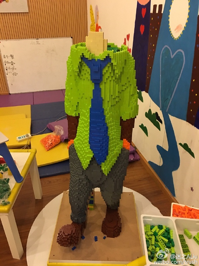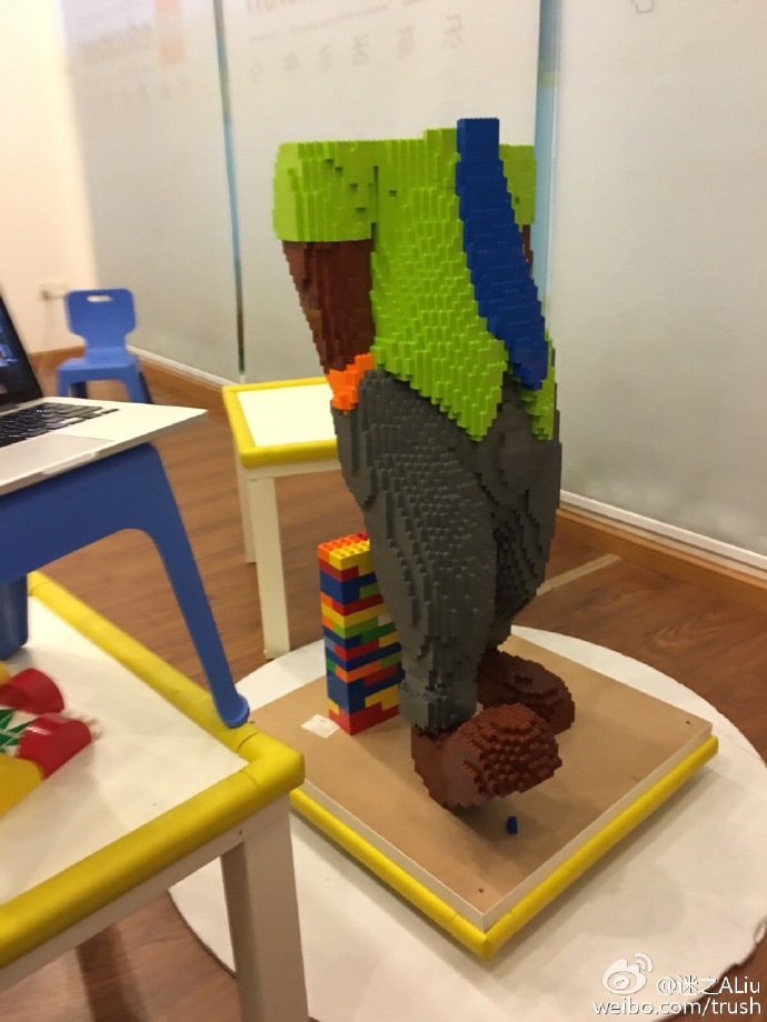 一个高将近1.8米的尼克狐,由上万块乐高积木组成,价值10万余元,年轻的作者为了制作它3天3夜不眠不休。但这个作品却在刚刚展出1小时后被一个小朋友照相的时候推倒了……狐狸碎成渣的图片在网上热传,但是作者赵先生却特别宽容:小孩子也不是故意的,不要赔偿。