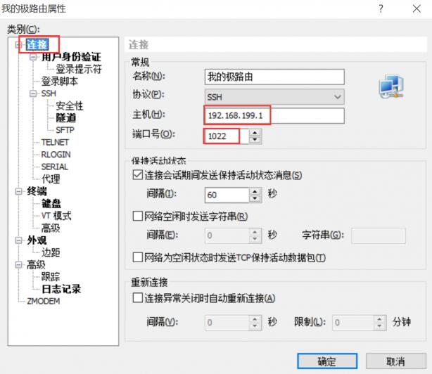 打开xshell后,点左上角的“新建”,首先设置连接的参数。如下图所示,名称随便写,主机写192.168.199.1,端口号为1022。
