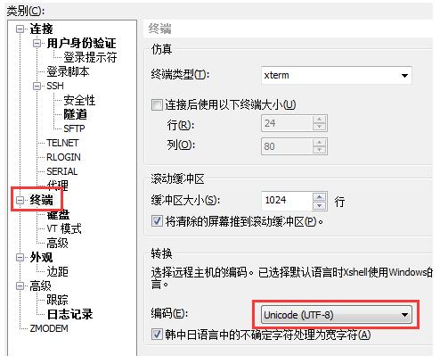 为了防止中文显示乱码,我们还需要把终端的编码改为UTF-8,如下图所示。