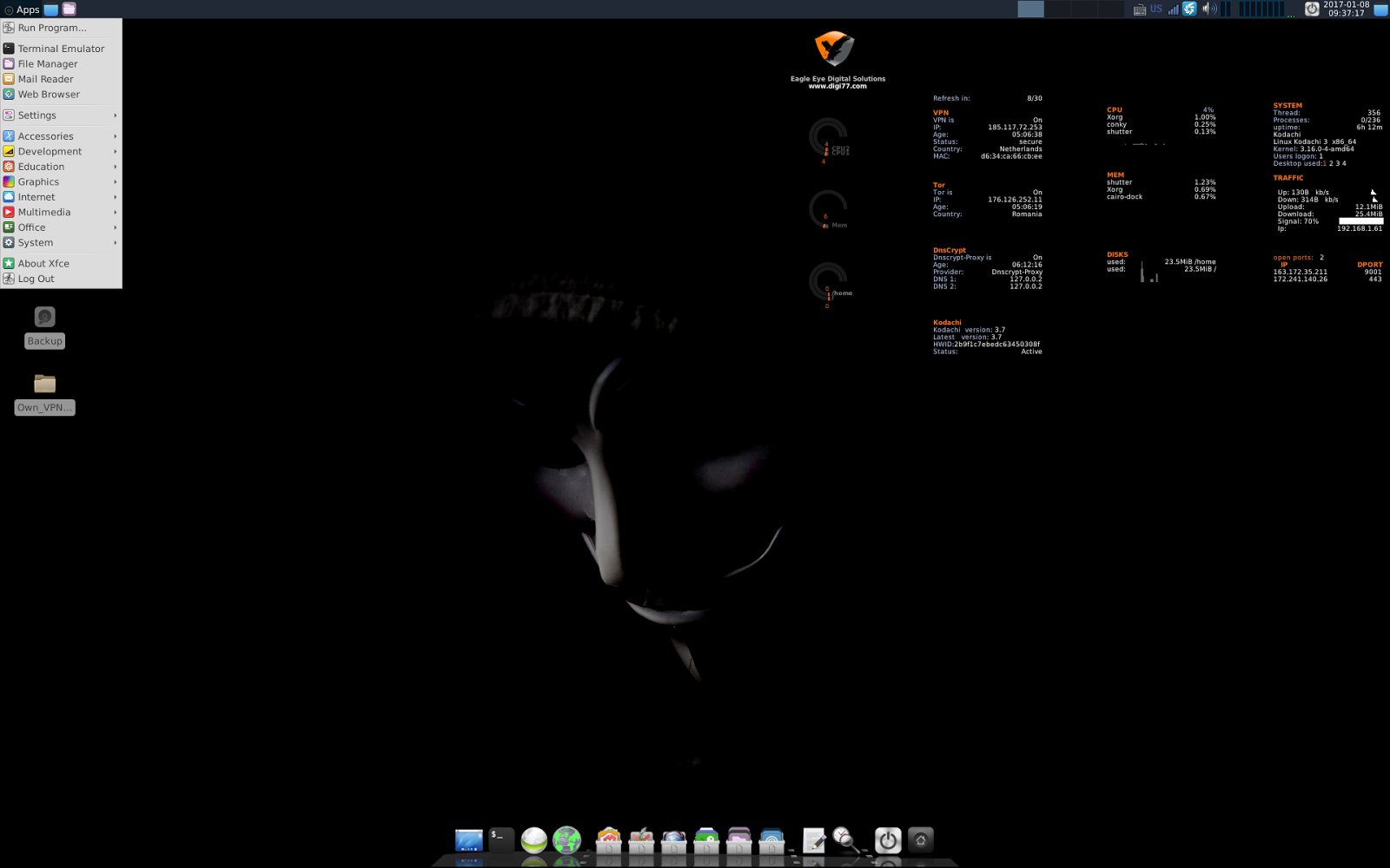 Kodachi 是基于实体 Debian Linux 和 定制 XFCE ,这使得 Kodachi 系统非常的稳定、安全并且独特。