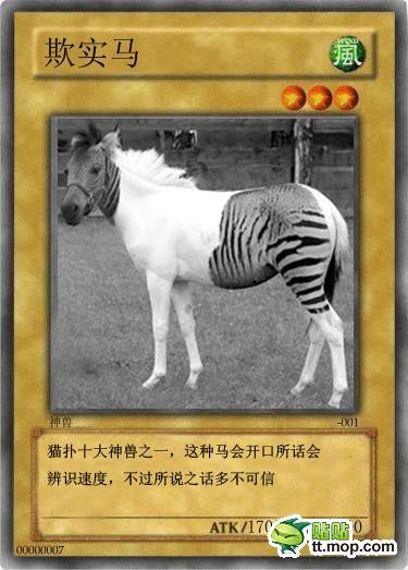 2.“欺实马”是一种很像斑马的神驹,与斑马黑白相间的条纹不同的是,这种马是绿荧光色与白色条纹相间。这种马会开口所话会辨识速度,不过所说之话多不可信。