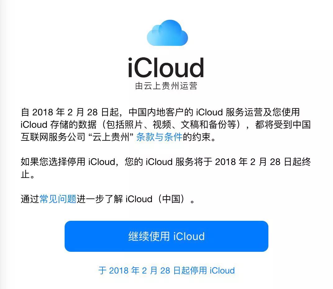 【编者注】2018年1月9日,苹果公司正式宣布,从2018年2月28日起,其云端存储服务 iCloud 将由中国公司“云上贵州”运营,新隐私条款要求用户“理解并同意,苹果公司和云上贵州有权访问您在此服务中存储的所有数据,包括根据适用法律向对方和在彼此之间共享、交换和披露所有用户数据(包括内容)的权利。”