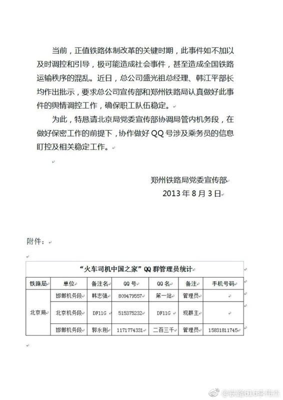 根据国家有关部门通报,郑州铁路局职工李伟杰建立了一个1500多人加入的QQ群,一些骨干在群中发表过激言论…