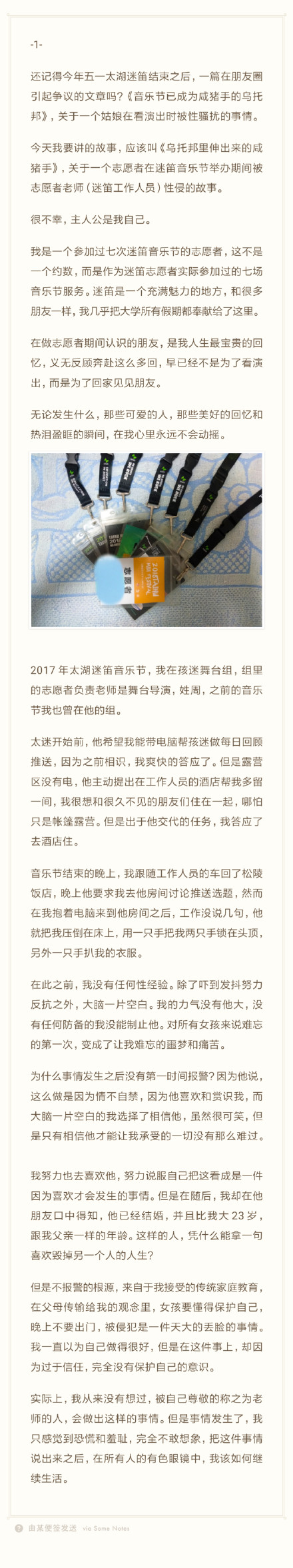今天我要讲的故事,应该叫《乌托邦里伸出来的成猪手》,关于一个志愿者在迷笛音乐节举办期间被志愿者老师(迷笛工作人员)性侵的故事。